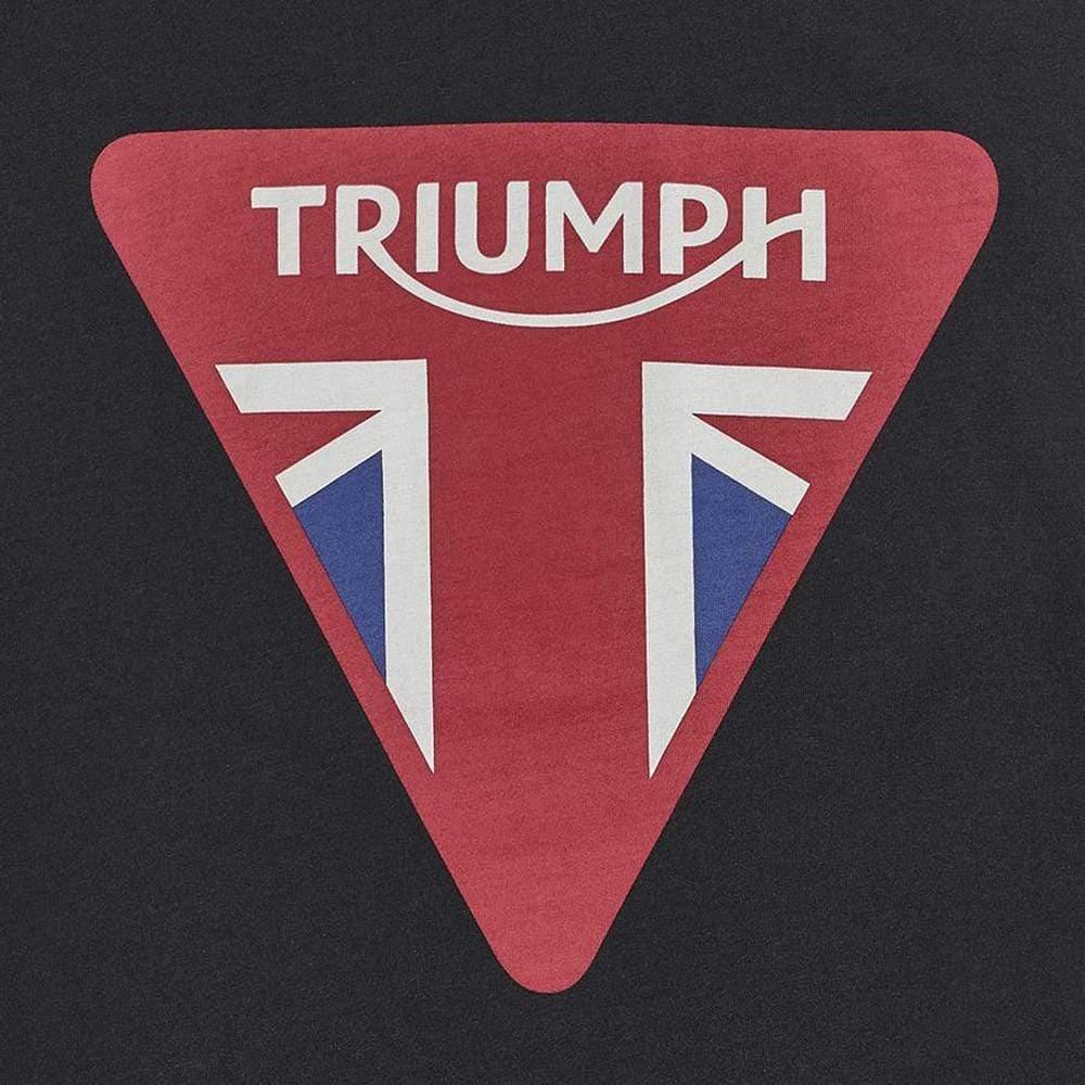 100% soft cotton 160g weight Jet Black tee with Triumph logo and uniquely colourful Union Jack version of Triumph's iconic triangle badge.